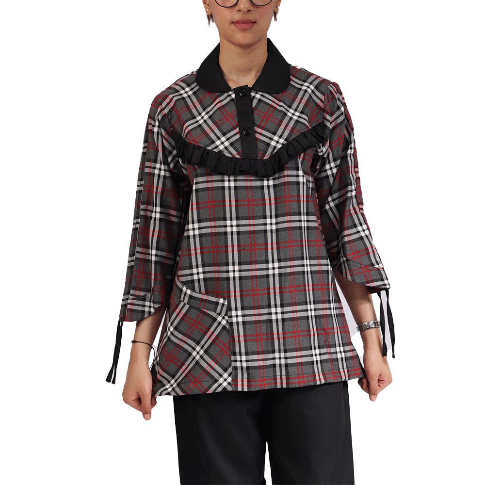 - القطعة العلوية ذات طول مناسب يصل حتى الركبة وتحتوي علي جيب على الطرف الأيسر يتزين طرفة أيضا باللون الأبيض يعطي تناسقا رائعا.